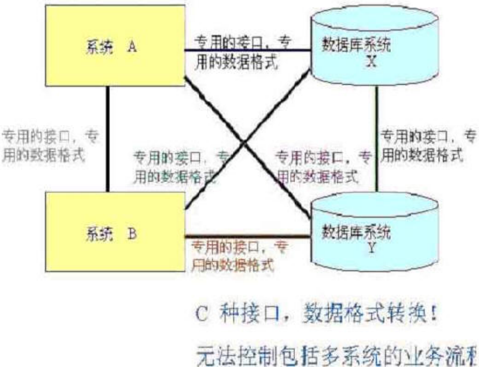由于这些专用连接完全互相独立,其只能满足系统两两互连通讯的需求,无法实现涉及多个应用系统的复杂业务流程。